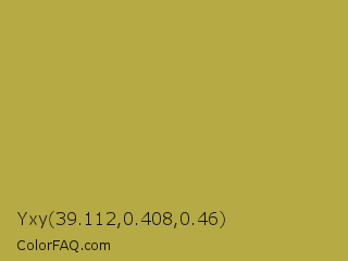 Yxy 39.112,0.408,0.46 Color is a normal yellow color and the nearest color is Brass #b5a642. Hex code #b6aa44 and RGB value is rgb(182,170,68). In RGB color space, this color is composed of 71% red, 67% green, 27% blue, In CMYK color space, this color is composed of 0% cyan, 7% magenta, 63% yellow , 29% black , In HSL color space, this color has a hue angle of 54° , 46% saturation and 49% lightness.
