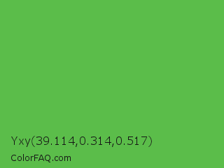 Yxy 39.114,0.314,0.517 Color is a normal green color and the nearest color is Apple #4fa83d. Hex code #5bbd4a and RGB value is rgb(91,189,74). In RGB color space, this color is composed of 36% red, 74% green, 29% blue, In CMYK color space, this color is composed of 52% cyan, 0% magenta, 61% yellow , 26% black , In HSL color space, this color has a hue angle of 111° , 47% saturation and 52% lightness.