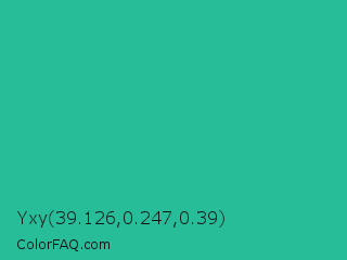 Yxy 39.126,0.247,0.39 Color is a normal cyan color and the nearest color is Mountain Meadow #30ba8f. Hex code #27bd99 and RGB value is rgb(39,189,153). In RGB color space, this color is composed of 15% red, 74% green, 60% blue, In CMYK color space, this color is composed of 79% cyan, 0% magenta, 19% yellow , 26% black , In HSL color space, this color has a hue angle of 166° , 66% saturation and 45% lightness.