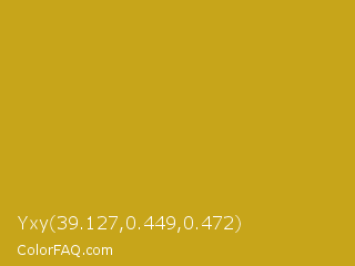 Yxy 39.127,0.449,0.472 Color is a normal yellow color and the nearest color is Lemon Curry #cca01d. Hex code #c7a51a and RGB value is rgb(199,165,26). In RGB color space, this color is composed of 78% red, 65% green, 10% blue, In CMYK color space, this color is composed of 0% cyan, 17% magenta, 87% yellow , 22% black , In HSL color space, this color has a hue angle of 48° , 77% saturation and 44% lightness.