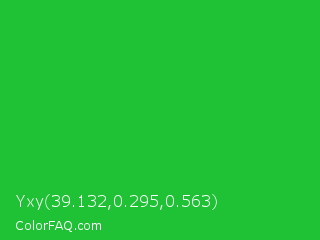 Yxy 39.132,0.295,0.563 Color is a normal green color and the nearest color is Lime Green #32cd32. Hex code #1fc235 and RGB value is rgb(31,194,53). In RGB color space, this color is composed of 12% red, 76% green, 21% blue, In CMYK color space, this color is composed of 84% cyan, 0% magenta, 73% yellow , 24% black , In HSL color space, this color has a hue angle of 128° , 72% saturation and 44% lightness.