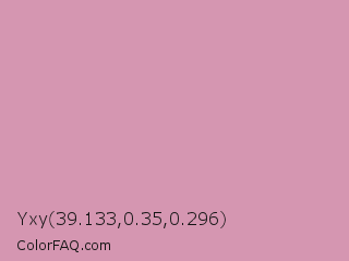 Yxy 39.133,0.35,0.296 Color is a light rose color and the nearest color is Careys Pink #d29eaa. Hex code #d596b1 and RGB value is rgb(213,150,177). In RGB color space, this color is composed of 84% red, 59% green, 69% blue, In CMYK color space, this color is composed of 0% cyan, 30% magenta, 17% yellow , 16% black , In HSL color space, this color has a hue angle of 334° , 43% saturation and 71% lightness.