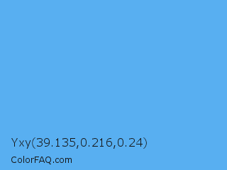 Yxy 39.135,0.216,0.24 Color is a light blue color and the nearest color is Blue Jeans #5dadec. Hex code #58aff1 and RGB value is rgb(88,175,241). In RGB color space, this color is composed of 35% red, 69% green, 95% blue, In CMYK color space, this color is composed of 63% cyan, 27% magenta, 0% yellow , 5% black , In HSL color space, this color has a hue angle of 206° , 85% saturation and 65% lightness.