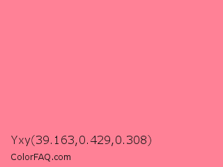 Yxy 39.163,0.429,0.308 Color is a light red color and the nearest color is Tulip #ff878d. Hex code #ff8196 and RGB value is rgb(255,129,150). In RGB color space, this color is composed of 100% red, 51% green, 59% blue, In CMYK color space, this color is composed of 0% cyan, 49% magenta, 41% yellow , 0% black , In HSL color space, this color has a hue angle of 350° , 100% saturation and 75% lightness.