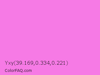 Yxy 39.169,0.334,0.221 Color is a light magenta color and the nearest color is Pale Magenta #f984e5. Hex code #f67ae5 and RGB value is rgb(246,122,229). In RGB color space, this color is composed of 96% red, 48% green, 90% blue, In CMYK color space, this color is composed of 0% cyan, 50% magenta, 7% yellow , 4% black , In HSL color space, this color has a hue angle of 308° , 87% saturation and 72% lightness.