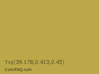 Yxy 39.178,0.413,0.45 Color is a normal yellow color and the nearest color is Brass #b5a642. Hex code #bca849 and RGB value is rgb(188,168,73). In RGB color space, this color is composed of 74% red, 66% green, 29% blue, In CMYK color space, this color is composed of 0% cyan, 11% magenta, 61% yellow , 26% black , In HSL color space, this color has a hue angle of 50° , 46% saturation and 51% lightness.