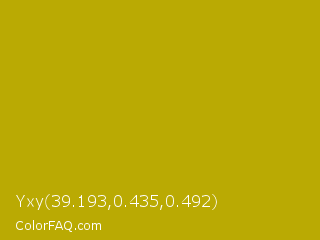 Yxy 39.193,0.435,0.492 Color is a normal yellow color and the nearest color is Buddha Gold #c1a004. Hex code #baaa03 and RGB value is rgb(186,170,3). In RGB color space, this color is composed of 73% red, 67% green, 1% blue, In CMYK color space, this color is composed of 0% cyan, 9% magenta, 98% yellow , 27% black , In HSL color space, this color has a hue angle of 55° , 97% saturation and 37% lightness.