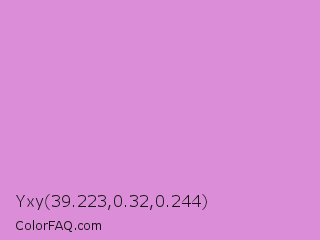 Yxy 39.223,0.32,0.244 Color is a light magenta color and the nearest color is Light Orchid #e29cd2. Hex code #dc8dd8 and RGB value is rgb(220,141,216). In RGB color space, this color is composed of 86% red, 55% green, 85% blue, In CMYK color space, this color is composed of 0% cyan, 36% magenta, 2% yellow , 14% black , In HSL color space, this color has a hue angle of 303° , 53% saturation and 71% lightness.