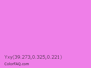 Yxy 39.273,0.325,0.221 Color is a light magenta color and the nearest color is Lavender Magenta #ee82ee. Hex code #ef7fe8 and RGB value is rgb(239,127,232). In RGB color space, this color is composed of 94% red, 50% green, 91% blue, In CMYK color space, this color is composed of 0% cyan, 47% magenta, 3% yellow , 6% black , In HSL color space, this color has a hue angle of 304° , 78% saturation and 72% lightness.