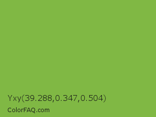 Yxy 39.288,0.347,0.504 Color is a normal green color and the nearest color is Sushi #87ab39. Hex code #80b844 and RGB value is rgb(128,184,68). In RGB color space, this color is composed of 50% red, 72% green, 27% blue, In CMYK color space, this color is composed of 30% cyan, 0% magenta, 63% yellow , 28% black , In HSL color space, this color has a hue angle of 89° , 46% saturation and 49% lightness.