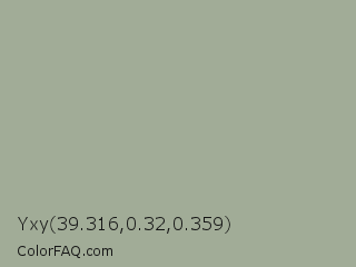 Yxy 39.316,0.32,0.359 Color is a light green color and the nearest color is Bud #a8ae9c. Hex code #a1ac97 and RGB value is rgb(161,172,151). In RGB color space, this color is composed of 63% red, 67% green, 59% blue, In CMYK color space, this color is composed of 6% cyan, 0% magenta, 12% yellow , 33% black , In HSL color space, this color has a hue angle of 91° , 11% saturation and 63% lightness.