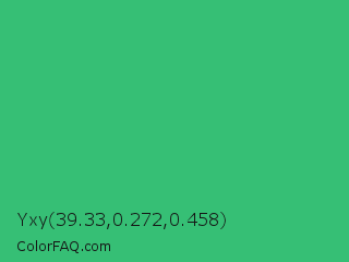 Yxy 39.33,0.272,0.458 Color is a normal green color and the nearest color is Medium Sea Green #3cb371. Hex code #36bf75 and RGB value is rgb(54,191,117). In RGB color space, this color is composed of 21% red, 75% green, 46% blue, In CMYK color space, this color is composed of 72% cyan, 0% magenta, 39% yellow , 25% black , In HSL color space, this color has a hue angle of 148° , 56% saturation and 48% lightness.