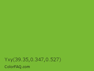 Yxy 39.35,0.347,0.527 Color is a normal green color and the nearest color is Green RYB #66b032. Hex code #78ba33 and RGB value is rgb(120,186,51). In RGB color space, this color is composed of 47% red, 73% green, 20% blue, In CMYK color space, this color is composed of 35% cyan, 0% magenta, 73% yellow , 27% black , In HSL color space, this color has a hue angle of 89° , 57% saturation and 46% lightness.