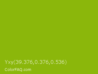 Yxy 39.376,0.376,0.536 Color is a normal lime color and the nearest color is Apple Green #8db600. Hex code #8bb70b and RGB value is rgb(139,183,11). In RGB color space, this color is composed of 55% red, 72% green, 4% blue, In CMYK color space, this color is composed of 24% cyan, 0% magenta, 94% yellow , 28% black , In HSL color space, this color has a hue angle of 75° , 89% saturation and 38% lightness.