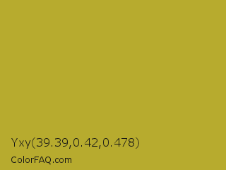 Yxy 39.39,0.42,0.478 Color is a normal yellow color and the nearest color is Hokey Pokey #c8a528. Hex code #b7ab2e and RGB value is rgb(183,171,46). In RGB color space, this color is composed of 72% red, 67% green, 18% blue, In CMYK color space, this color is composed of 0% cyan, 7% magenta, 75% yellow , 28% black , In HSL color space, this color has a hue angle of 55° , 60% saturation and 45% lightness.