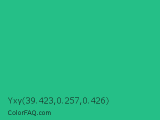 Yxy 39.423,0.257,0.426 Color is a normal green color and the nearest color is Mountain Meadow #30ba8f. Hex code #25bf87 and RGB value is rgb(37,191,135). In RGB color space, this color is composed of 15% red, 75% green, 53% blue, In CMYK color space, this color is composed of 81% cyan, 0% magenta, 29% yellow , 25% black , In HSL color space, this color has a hue angle of 158° , 68% saturation and 45% lightness.