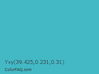 Yxy 39.425,0.231,0.31 Color is a normal cyan color and the nearest color is Pelorous #3eabbf. Hex code #42b8c4 and RGB value is rgb(66,184,196). In RGB color space, this color is composed of 26% red, 72% green, 77% blue, In CMYK color space, this color is composed of 66% cyan, 6% magenta, 0% yellow , 23% black , In HSL color space, this color has a hue angle of 186° , 52% saturation and 51% lightness.