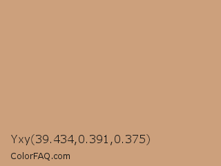 Yxy 39.434,0.391,0.375 Color is a light orange color and the nearest color is Antique Brass #cd9575. Hex code #cca07c and RGB value is rgb(204,160,124). In RGB color space, this color is composed of 80% red, 63% green, 49% blue, In CMYK color space, this color is composed of 0% cyan, 22% magenta, 39% yellow , 20% black , In HSL color space, this color has a hue angle of 27° , 44% saturation and 64% lightness.