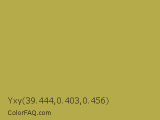 Yxy 39.444,0.403,0.456 Color is a normal yellow color and the nearest color is Brass #b5a642. Hex code #b5ab4a and RGB value is rgb(181,171,74). In RGB color space, this color is composed of 71% red, 67% green, 29% blue, In CMYK color space, this color is composed of 0% cyan, 6% magenta, 59% yellow , 29% black , In HSL color space, this color has a hue angle of 54° , 42% saturation and 50% lightness.