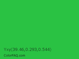 Yxy 39.46,0.293,0.544 Color is a normal green color and the nearest color is Lime Green #32cd32. Hex code #2ac243 and RGB value is rgb(42,194,67). In RGB color space, this color is composed of 16% red, 76% green, 26% blue, In CMYK color space, this color is composed of 78% cyan, 0% magenta, 65% yellow , 24% black , In HSL color space, this color has a hue angle of 130° , 64% saturation and 46% lightness.