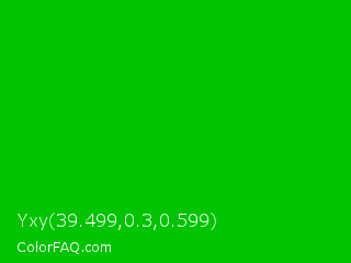 Yxy 39.499,0.3,0.599 Color is a normal green color and the nearest color is Vivid Malachite #00cc33. Hex code #02c403 and RGB value is rgb(2,196,3). In RGB color space, this color is composed of 1% red, 77% green, 1% blue, In CMYK color space, this color is composed of 99% cyan, 0% magenta, 98% yellow , 23% black , In HSL color space, this color has a hue angle of 120° , 98% saturation and 39% lightness.