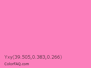 Yxy 39.505,0.383,0.266 Color is a light rose color and the nearest color is Persian Pink #f77fbe. Hex code #fc7fbc and RGB value is rgb(252,127,188). In RGB color space, this color is composed of 99% red, 50% green, 74% blue, In CMYK color space, this color is composed of 0% cyan, 50% magenta, 25% yellow , 1% black , In HSL color space, this color has a hue angle of 331° , 95% saturation and 74% lightness.