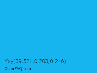 Yxy 39.521,0.203,0.246 Color is a normal blue color and the nearest color is Spiro Disco Ball #0fc0fc. Hex code #16b5f0 and RGB value is rgb(22,181,240). In RGB color space, this color is composed of 9% red, 71% green, 94% blue, In CMYK color space, this color is composed of 91% cyan, 25% magenta, 0% yellow , 6% black , In HSL color space, this color has a hue angle of 196° , 88% saturation and 51% lightness.