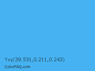 Yxy 39.531,0.211,0.243 Color is a light blue color and the nearest color is Picton Blue #45b1e8. Hex code #46b2f1 and RGB value is rgb(70,178,241). In RGB color space, this color is composed of 27% red, 70% green, 95% blue, In CMYK color space, this color is composed of 71% cyan, 26% magenta, 0% yellow , 5% black , In HSL color space, this color has a hue angle of 202° , 86% saturation and 61% lightness.