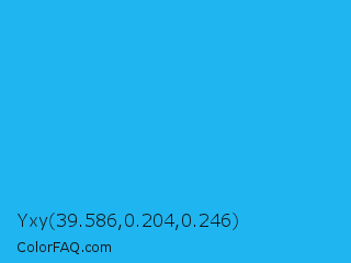 Yxy 39.586,0.204,0.246 Color is a normal blue color and the nearest color is Button Blue #24a0ed. Hex code #1fb5f0 and RGB value is rgb(31,181,240). In RGB color space, this color is composed of 12% red, 71% green, 94% blue, In CMYK color space, this color is composed of 87% cyan, 25% magenta, 0% yellow , 6% black , In HSL color space, this color has a hue angle of 197° , 87% saturation and 53% lightness.