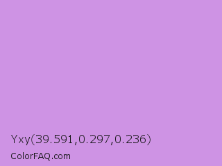 Yxy 39.591,0.297,0.236 Color is a light purple color and the nearest color is Bright Ube #d19fe8. Hex code #ce93e4 and RGB value is rgb(206,147,228). In RGB color space, this color is composed of 81% red, 58% green, 89% blue, In CMYK color space, this color is composed of 10% cyan, 36% magenta, 0% yellow , 11% black , In HSL color space, this color has a hue angle of 284° , 60% saturation and 74% lightness.