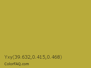 Yxy 39.632,0.415,0.468 Color is a normal yellow color and the nearest color is Brass #b5a642. Hex code #b8ab3b and RGB value is rgb(184,171,59). In RGB color space, this color is composed of 72% red, 67% green, 23% blue, In CMYK color space, this color is composed of 0% cyan, 7% magenta, 68% yellow , 28% black , In HSL color space, this color has a hue angle of 54° , 51% saturation and 48% lightness.