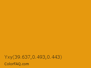 Yxy 39.637,0.493,0.443 Color is a normal orange color and the nearest color is Gamboge #e49b0f. Hex code #e6990e and RGB value is rgb(230,153,14). In RGB color space, this color is composed of 90% red, 60% green, 5% blue, In CMYK color space, this color is composed of 0% cyan, 33% magenta, 94% yellow , 10% black , In HSL color space, this color has a hue angle of 39° , 89% saturation and 48% lightness.