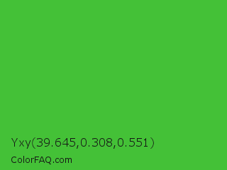 Yxy 39.645,0.308,0.551 Color is a normal green color and the nearest color is Lime Green #32cd32. Hex code #44c137 and RGB value is rgb(68,193,55). In RGB color space, this color is composed of 27% red, 76% green, 22% blue, In CMYK color space, this color is composed of 65% cyan, 0% magenta, 72% yellow , 24% black , In HSL color space, this color has a hue angle of 114° , 56% saturation and 49% lightness.