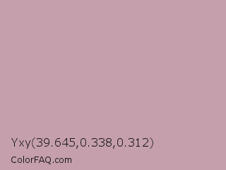 Yxy 39.645,0.338,0.312 Color is a light rose color and the nearest color is Careys Pink #d29eaa. Hex code #c59fac and RGB value is rgb(197,159,172). In RGB color space, this color is composed of 77% red, 62% green, 67% blue, In CMYK color space, this color is composed of 0% cyan, 19% magenta, 13% yellow , 23% black , In HSL color space, this color has a hue angle of 339° , 25% saturation and 70% lightness.