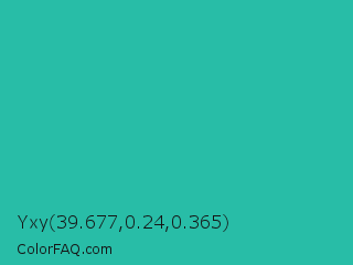 Yxy 39.677,0.24,0.365 Color is a normal cyan color and the nearest color is Light Sea Green #20b2aa. Hex code #28bda7 and RGB value is rgb(40,189,167). In RGB color space, this color is composed of 16% red, 74% green, 65% blue, In CMYK color space, this color is composed of 79% cyan, 0% magenta, 12% yellow , 26% black , In HSL color space, this color has a hue angle of 171° , 65% saturation and 45% lightness.