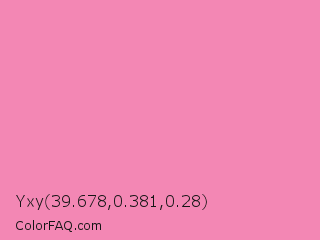 Yxy 39.678,0.381,0.28 Color is a light rose color and the nearest color is Tickle Me Pink #fc89ac. Hex code #f387b4 and RGB value is rgb(243,135,180). In RGB color space, this color is composed of 95% red, 53% green, 71% blue, In CMYK color space, this color is composed of 0% cyan, 44% magenta, 26% yellow , 5% black , In HSL color space, this color has a hue angle of 335° , 82% saturation and 74% lightness.