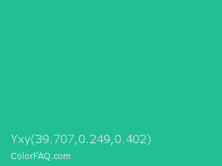 Yxy 39.707,0.249,0.402 Color is a normal cyan color and the nearest color is Mountain Meadow #30ba8f. Hex code #20bf94 and RGB value is rgb(32,191,148). In RGB color space, this color is composed of 13% red, 75% green, 58% blue, In CMYK color space, this color is composed of 83% cyan, 0% magenta, 23% yellow , 25% black , In HSL color space, this color has a hue angle of 164° , 71% saturation and 44% lightness.