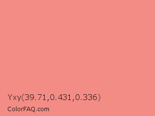 Yxy 39.71,0.431,0.336 Color is a light red color and the nearest color is Geraldine #fb8989. Hex code #f48c86 and RGB value is rgb(244,140,134). In RGB color space, this color is composed of 96% red, 55% green, 53% blue, In CMYK color space, this color is composed of 0% cyan, 43% magenta, 45% yellow , 4% black , In HSL color space, this color has a hue angle of 3° , 83% saturation and 74% lightness.