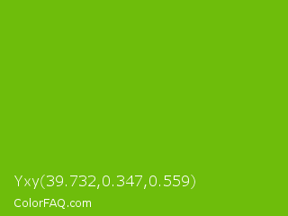 Yxy 39.732,0.347,0.559 Color is a normal green color and the nearest color is Lima #76bd17. Hex code #6ebd0b and RGB value is rgb(110,189,11). In RGB color space, this color is composed of 43% red, 74% green, 4% blue, In CMYK color space, this color is composed of 42% cyan, 0% magenta, 94% yellow , 26% black , In HSL color space, this color has a hue angle of 87° , 89% saturation and 39% lightness.