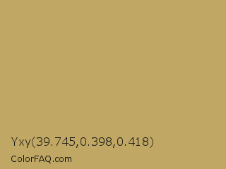 Yxy 39.745,0.398,0.418 Color is a normal orange color and the nearest color is Husk #b7a458. Hex code #c0a763 and RGB value is rgb(192,167,99). In RGB color space, this color is composed of 75% red, 65% green, 39% blue, In CMYK color space, this color is composed of 0% cyan, 13% magenta, 48% yellow , 25% black , In HSL color space, this color has a hue angle of 44° , 42% saturation and 57% lightness.