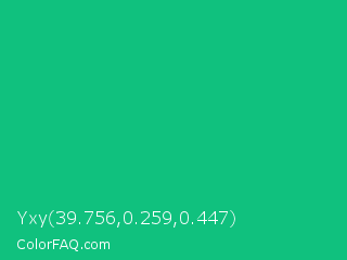 Yxy 39.756,0.259,0.447 Color is a normal green color and the nearest color is Mountain Meadow Crayola #1ab385. Hex code #10c17e and RGB value is rgb(16,193,126). In RGB color space, this color is composed of 6% red, 76% green, 49% blue, In CMYK color space, this color is composed of 92% cyan, 0% magenta, 35% yellow , 24% black , In HSL color space, this color has a hue angle of 157° , 85% saturation and 41% lightness.
