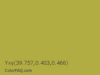 Yxy 39.757,0.403,0.466 Color is a normal yellow color and the nearest color is Brass #b5a642. Hex code #b2ad43 and RGB value is rgb(178,173,67). In RGB color space, this color is composed of 70% red, 68% green, 26% blue, In CMYK color space, this color is composed of 0% cyan, 3% magenta, 62% yellow , 30% black , In HSL color space, this color has a hue angle of 57° , 45% saturation and 48% lightness.