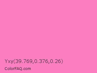 Yxy 39.769,0.376,0.26 Color is a light rose color and the nearest color is Persian Pink #f77fbe. Hex code #fc7fc2 and RGB value is rgb(252,127,194). In RGB color space, this color is composed of 99% red, 50% green, 76% blue, In CMYK color space, this color is composed of 0% cyan, 50% magenta, 23% yellow , 1% black , In HSL color space, this color has a hue angle of 328° , 95% saturation and 74% lightness.