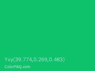 Yxy 39.774,0.269,0.483 Color is a normal green color and the nearest color is GO Green #00ab66. Hex code #0fc26b and RGB value is rgb(15,194,107). In RGB color space, this color is composed of 6% red, 76% green, 42% blue, In CMYK color space, this color is composed of 92% cyan, 0% magenta, 45% yellow , 24% black , In HSL color space, this color has a hue angle of 151° , 86% saturation and 41% lightness.