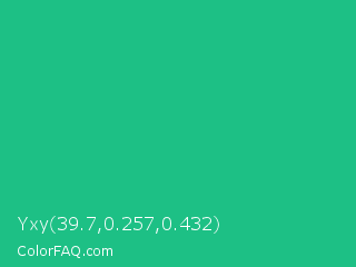Yxy 39.7,0.257,0.432 Color is a normal green color and the nearest color is Mountain Meadow Crayola #1ab385. Hex code #1dc085 and RGB value is rgb(29,192,133). In RGB color space, this color is composed of 11% red, 75% green, 52% blue, In CMYK color space, this color is composed of 85% cyan, 0% magenta, 31% yellow , 25% black , In HSL color space, this color has a hue angle of 158° , 74% saturation and 43% lightness.