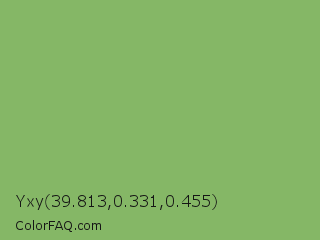 Yxy 39.813,0.331,0.455 Color is a normal green color and the nearest color is Dollar Bill #85bb65. Hex code #85b766 and RGB value is rgb(133,183,102). In RGB color space, this color is composed of 52% red, 72% green, 40% blue, In CMYK color space, this color is composed of 27% cyan, 0% magenta, 44% yellow , 28% black , In HSL color space, this color has a hue angle of 97° , 36% saturation and 56% lightness.