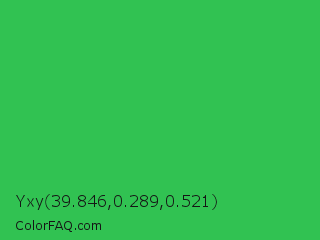 Yxy 39.846,0.289,0.521 Color is a normal green color and the nearest color is Chateau Green #40a860. Hex code #31c252 and RGB value is rgb(49,194,82). In RGB color space, this color is composed of 19% red, 76% green, 32% blue, In CMYK color space, this color is composed of 75% cyan, 0% magenta, 58% yellow , 24% black , In HSL color space, this color has a hue angle of 134° , 60% saturation and 48% lightness.