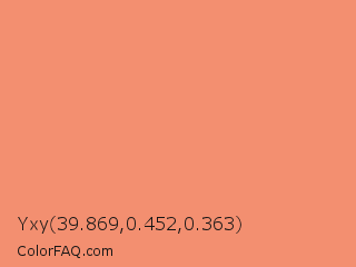 Yxy 39.869,0.452,0.363 Color is a light red color and the nearest color is Apricot #eb9373. Hex code #f38f70 and RGB value is rgb(243,143,112). In RGB color space, this color is composed of 95% red, 56% green, 44% blue, In CMYK color space, this color is composed of 0% cyan, 41% magenta, 54% yellow , 5% black , In HSL color space, this color has a hue angle of 14° , 85% saturation and 70% lightness.