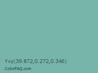 Yxy 39.872,0.272,0.346 Color is a normal cyan color and the nearest color is Gulf Stream #80b3ae. Hex code #77b5aa and RGB value is rgb(119,181,170). In RGB color space, this color is composed of 47% red, 71% green, 67% blue, In CMYK color space, this color is composed of 34% cyan, 0% magenta, 6% yellow , 29% black , In HSL color space, this color has a hue angle of 169° , 30% saturation and 59% lightness.