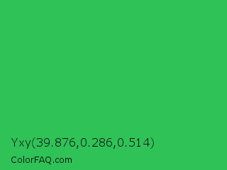 Yxy 39.876,0.286,0.514 Color is a normal green color and the nearest color is UFO Green #3cd070. Hex code #2fc257 and RGB value is rgb(47,194,87). In RGB color space, this color is composed of 18% red, 76% green, 34% blue, In CMYK color space, this color is composed of 76% cyan, 0% magenta, 55% yellow , 24% black , In HSL color space, this color has a hue angle of 136° , 61% saturation and 47% lightness.